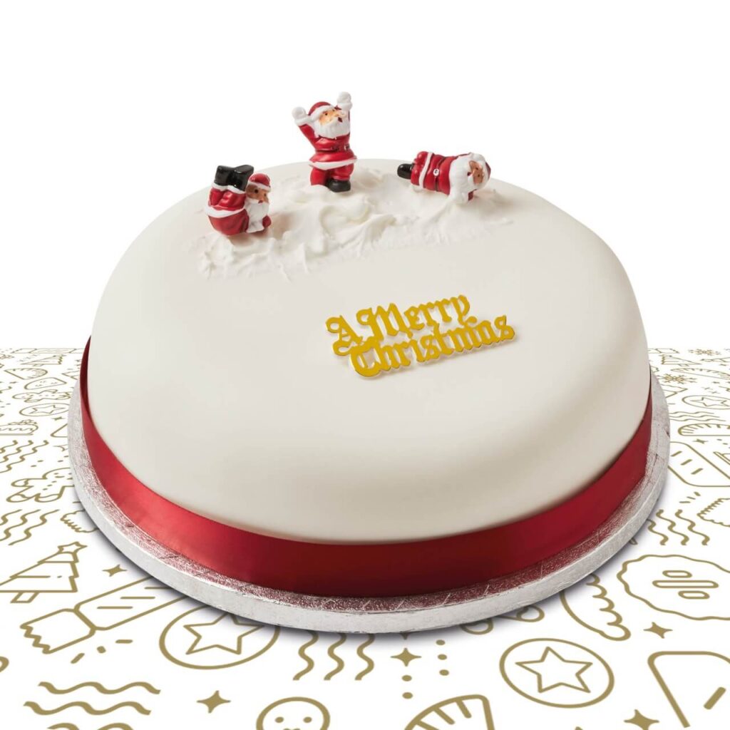 A moist and rich traditional fruit cake infused with rum, festive spices and packed with juicy sultanas, currants, almonds and glace cherries. Finished with smooth marzipan, icing, and a cheerful Father Christmas topper. Designs may vary slightly, but every cake is hand finished with care.