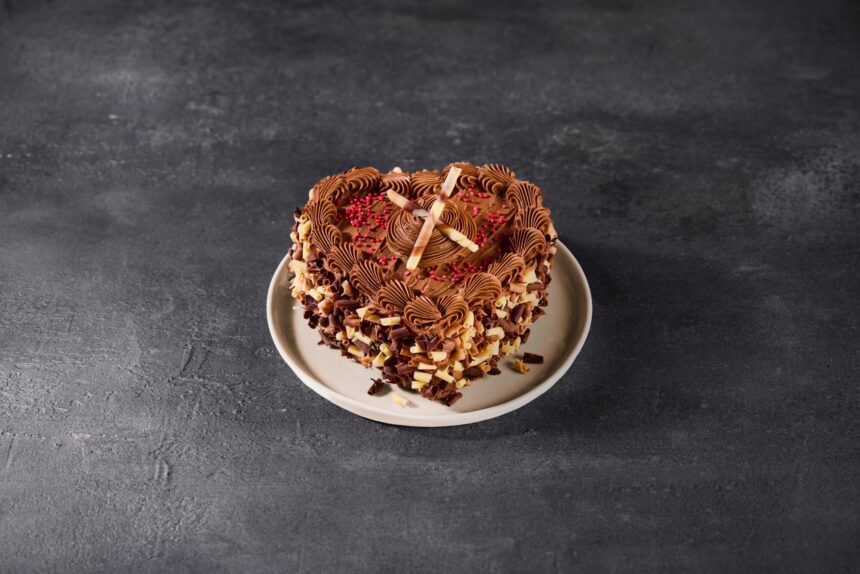 Layers of moist chocolate sponge cake and chocolate frosting, decorated with milk and white chocolate curls.