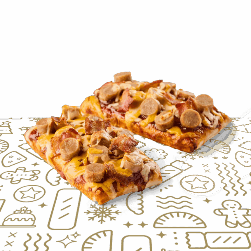 Our own recipe sausage, bacon pieces and BBQ sauce on a tasty pizza slice.
